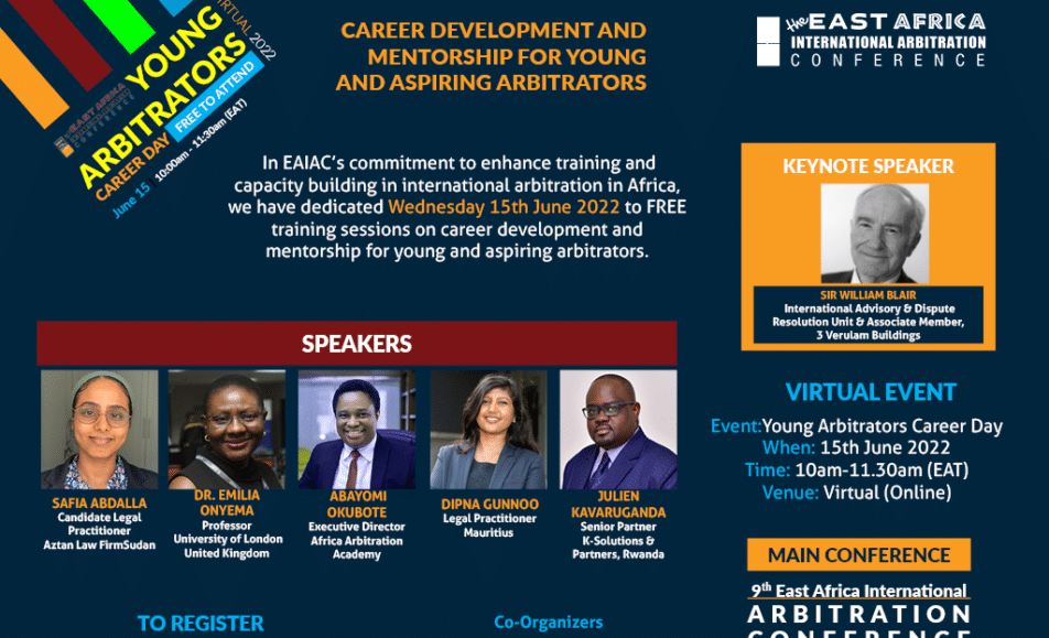 In EAIAC’s commitment to enhance training and capacity building in international arbitration in Africa, we have dedicated Wednesday 15th June 2022 to FREE training sessions on career development and mentorship for young and aspiring arbitrators.